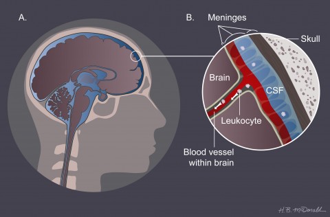 The increasing evidence for immune cell activity in the meninges as an early step in MS could have important implications for therapy development. "If all you are looking at is crossing the BBB that’s already inflamed, whereas the whole process starts because cells [are] getting into the spinal fluid, … you may be missing the boat," Ransohoff says. Furthermore, the meninges might be a preferred spot for studying the effects of therapeutic agents in rodents because microscopic techniques that can't be used to look deeply enough into the brain to see the BBB can still allow scientists to visualize details of live cellular activity in the meninges. "I think we can learn how established or newly developed therapeutics influence [immune cell behavior in the meninges]" with these tools, Flügel says. Such progress would allow researchers to better test and develop new treatments that interfere with entry into the CNS through this route, he adds.